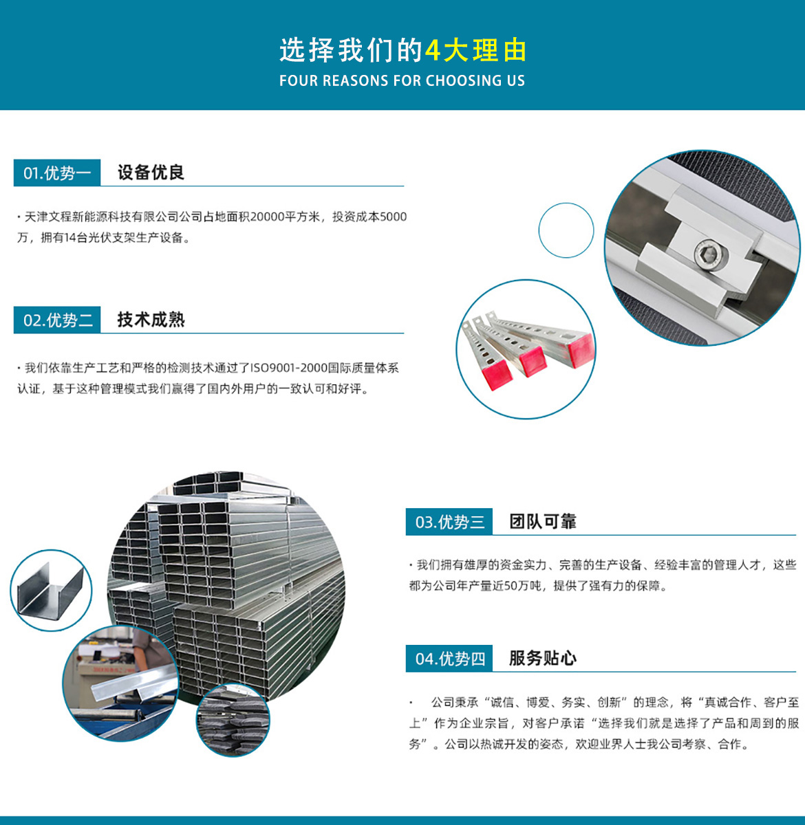 關(guān)于我們天津文程新能源科技有限公司成立于2021年,是專注于集中式、分布式、漁光互補和農(nóng)光互補等清潔能源發(fā)電的綜合性企業(yè) 公司是集設(shè)計、研發(fā)、生產(chǎn)、制造為一體的綜合型企業(yè)。公司占地面積20000平方米,注冊資金5000萬元整。公司坐落于華北鋼鐵重鎮(zhèn)--大邱莊,距天津市區(qū)50公里、鄰104和205國道及京滬高速,交通十分便捷。 本公司擁有三個生產(chǎn)車間,其中兩個冷彎型鋼車間,一個鋅鋁鎂型鋼車間,擁有自動冷彎成型機10條,自動數(shù)控沖孔機10條以及焊接加工等設(shè)備。主要生產(chǎn)產(chǎn)品有:太陽能光伏支架、各種規(guī)格的C/Z/U型鋼、抗震支架、管廊支架及整套配件等。